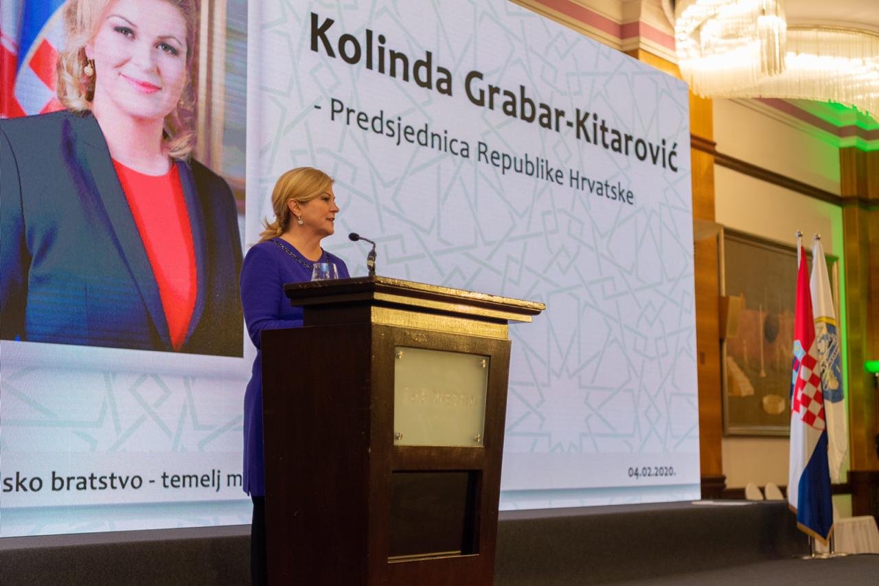 وقالت فخامة الرئيسة الكرواتية مخاطبة حضور المؤتمر: "إنه لشرف خاص لي رعاية مؤتمر يحمل عنوان "الأخوّة الإنسانية"، فهذه المبادرة من رابطة العالم الإسلامي بالتعاون مع الأبرشية الكرواتية والمشيخة الإسلامية الكرواتية فرصة مهمة لنا جميعاً لبناء عالم تسوده المحبة ويقوم على الأخوة"، مضيفة أن الله خلقنا متنوعين في ثقافاتنا وأدياننا وأعراقنا وغيرها، حتى يتسنى لنا التعاون في خدمة الإنسانية، وانطلاقاً من هذه الوحدة الإنسانية التي أرادها الخالق، فإن معاناة كل إنسان هي في الحقيقة معاناة للإنسانية جمعاء".