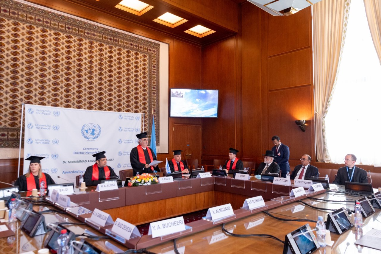من مقرها بجنيف وبحضور نائب أمينها العام: الأمم المتحدة عبر جامعتها للسلام تمنح درجة الدكتوراه الفخرية لمعالي الشيخ د. محمد العيسى، وذلك "تقديراً لجهوده المتميزة في دعم الدبلوماسية الدولية، وتعزيز السلام والوئام بين الشعوب ومحاربة الكراهية"، بحضور عدد من البرلمانيين الأوروبيين: