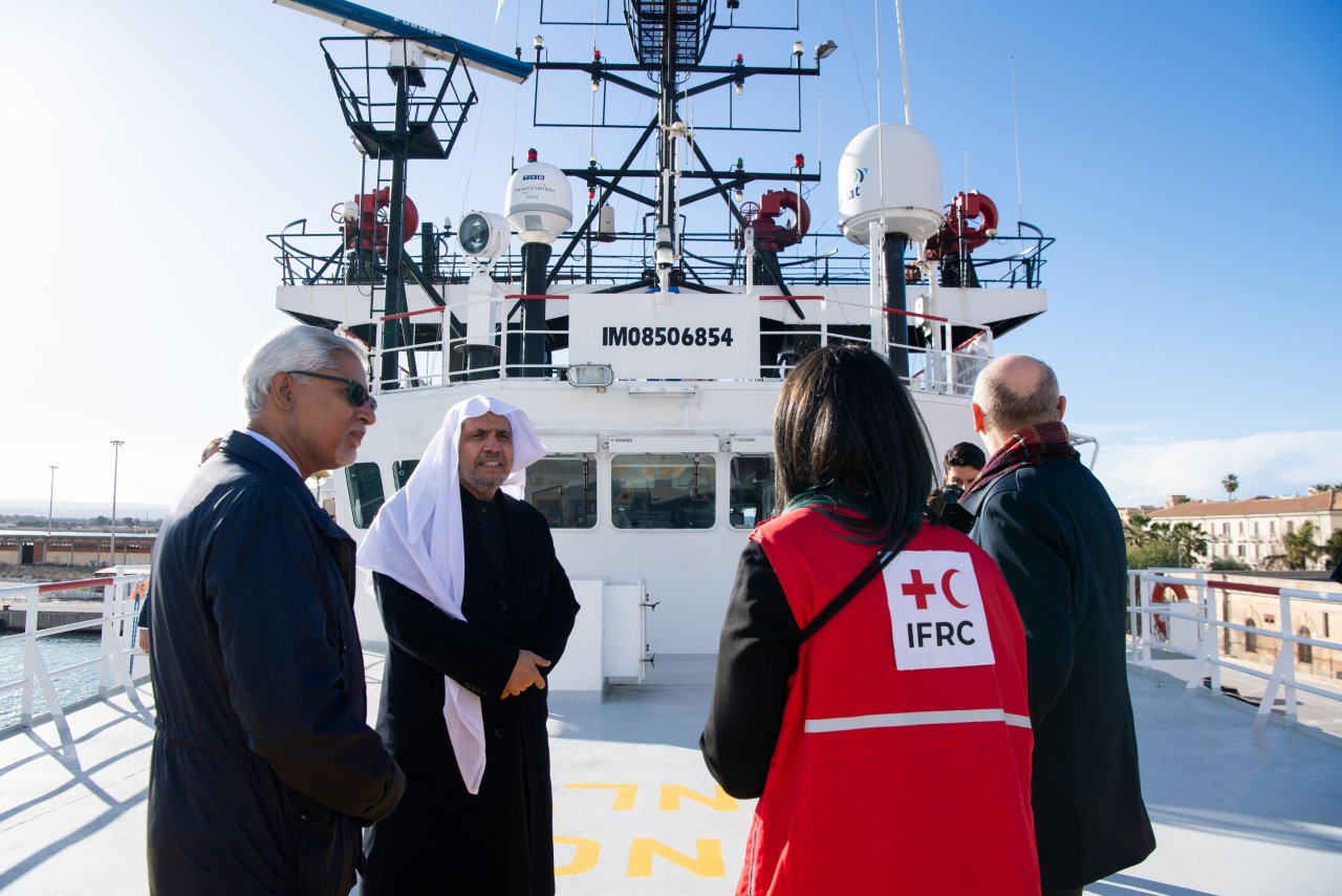في حدث فريد من نوعه، بين رؤساء كبرى المنظمات الدولية الناشطة في العمل الإنساني، اجتمع على متن السفينة الإنسانية الأشهر عالميًّا (أوشن فايكينغ)، على سواحل صقلّية الإيطالية "التي شهدت أكبر معاناة إنسانية للهجرة"، معالي الأمين العام لرابطة العالم الإسلامي، رئيس هيئة علماء المسلمين، فضيلة الشيخ الدكتور محمد بن عبدالكريم العيسى، بمعالي الأمين العام للاتحاد الدولي لجمعيات الصليب الأحمر والهلال الأحمر، السيد جاغان تشاباغين، بحضور سعادة رئيس جمعية الصليب الأحمر الإيطالي، السيد روزاريو ڤالاسترو.
