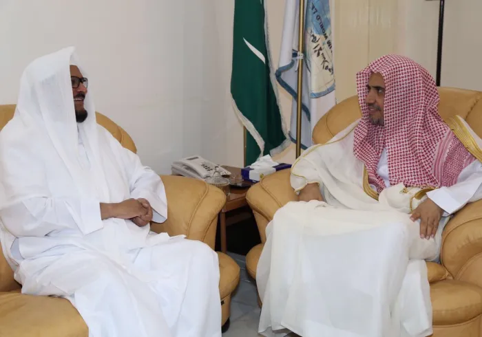 معالي الأمين العام مستقبلاً في مقر الرابطة بمكة المكرمة الشيخ فريد الدين مسعود مفتي عام بنجلاديش ورئيس جمعية علمائها