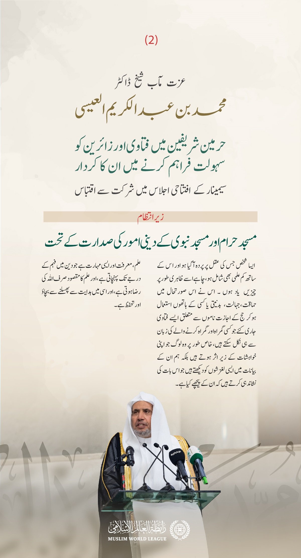 مسجد حرام اور مسجد نبوی کے دینی امور کے زیر اہتمام ”حرمین شریفین میں فتاوی اور زائرین کو سہولت فراہم کرنے میں ان کے کردار“ کے عنوان سے منعقدہ سیمینار کے افتتاحی اجلاس میں سیکرٹری جنرل رابطہ اور چیئرمین مسلم علماء کونسل، عزت مآب شیخ ڈاکٹر محمد العیسی کے خطاب سے اقتباس: